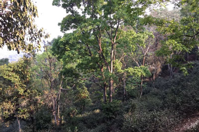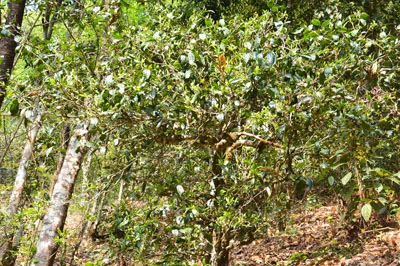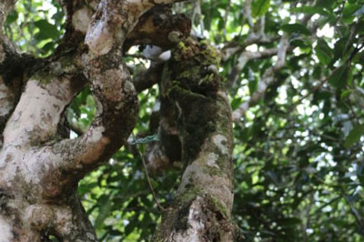 從向陽(yáng)村上山到半坡老寨大約8公里,路邊有很多古茶樹(shù),樹(shù)枝彎彎曲曲,高約3、4米,有很多分叉,每棵造型各異的茶樹(shù),就像一個(gè)個(gè)獨(dú)特的天然的盆景。 向陽(yáng)村的南糯茶王樹(shù)死去后,