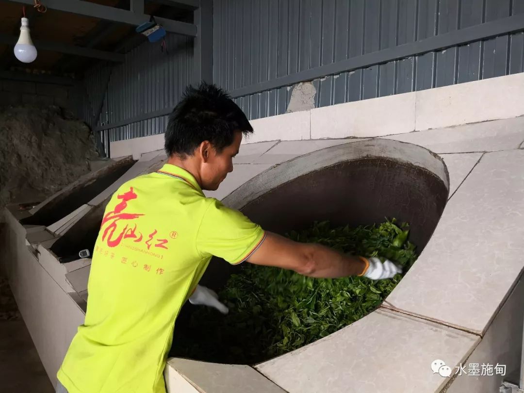不久前,周加彪重新裝修了廠房,六口鑲嵌在墻體中的大炒鍋以及有序擺放著的曬葉架,無(wú)不顯示著與好茶所匹配的清潔的衛(wèi)生環(huán)境。我想買(mǎi)些茶葉送給朋友,周加彪建議我順便親手體驗(yàn)一把制茶的過(guò)程。說(shuō)話間,他已將藏在內(nèi)屋的大灶燒好,待鍋溫達(dá)320度時(shí),他放入了晾好的鮮葉。體諒我人瘦膚白,他先將葉兒翻炒到一定的程度,待不容易糊鍋時(shí),交到了我手上。之后,我們一起揉葉一起晾曬,雖然我并不可能在短時(shí)間內(nèi)拾得要領(lǐng),卻也收獲了勞動(dòng)的快樂(lè),流了汗,且?guī)托≈苄值馨堰@片古茶宣傳于更多的人。