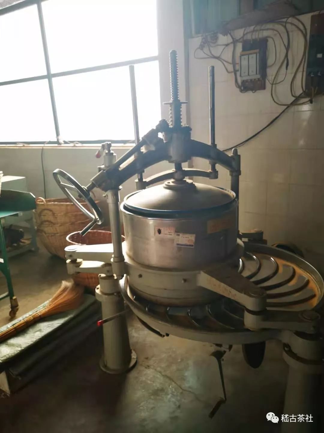 揉捻機上部是一個類似鍋爐的裝置,將萎凋好的茶葉放入其中。