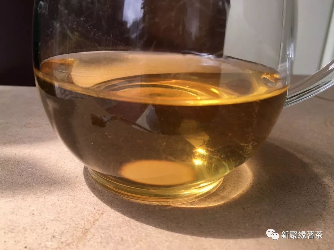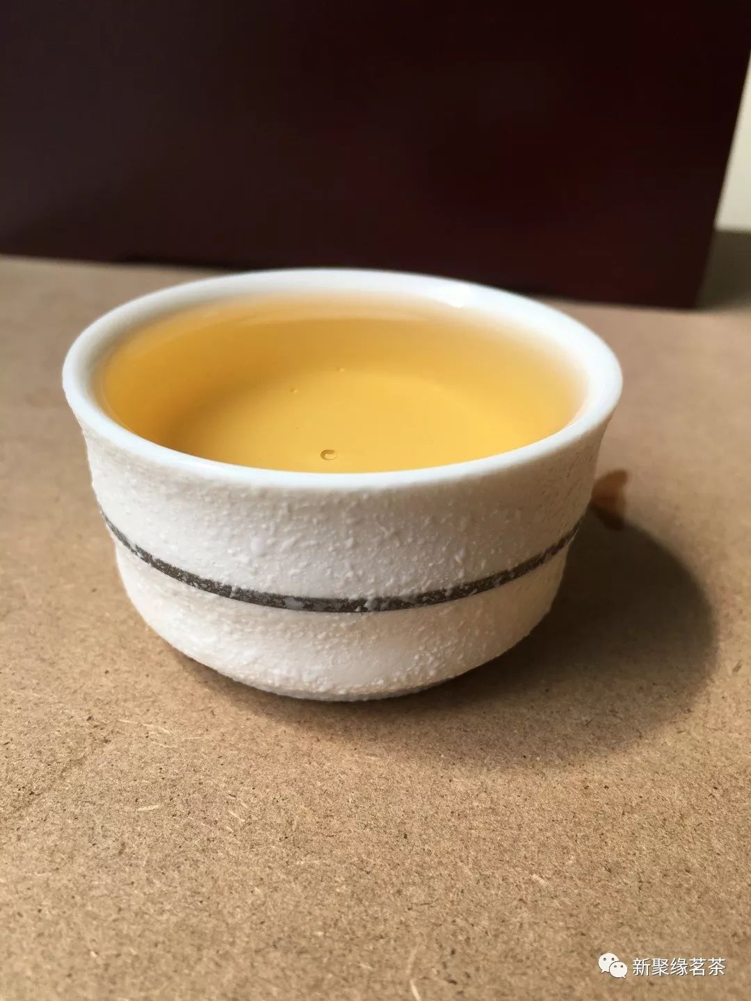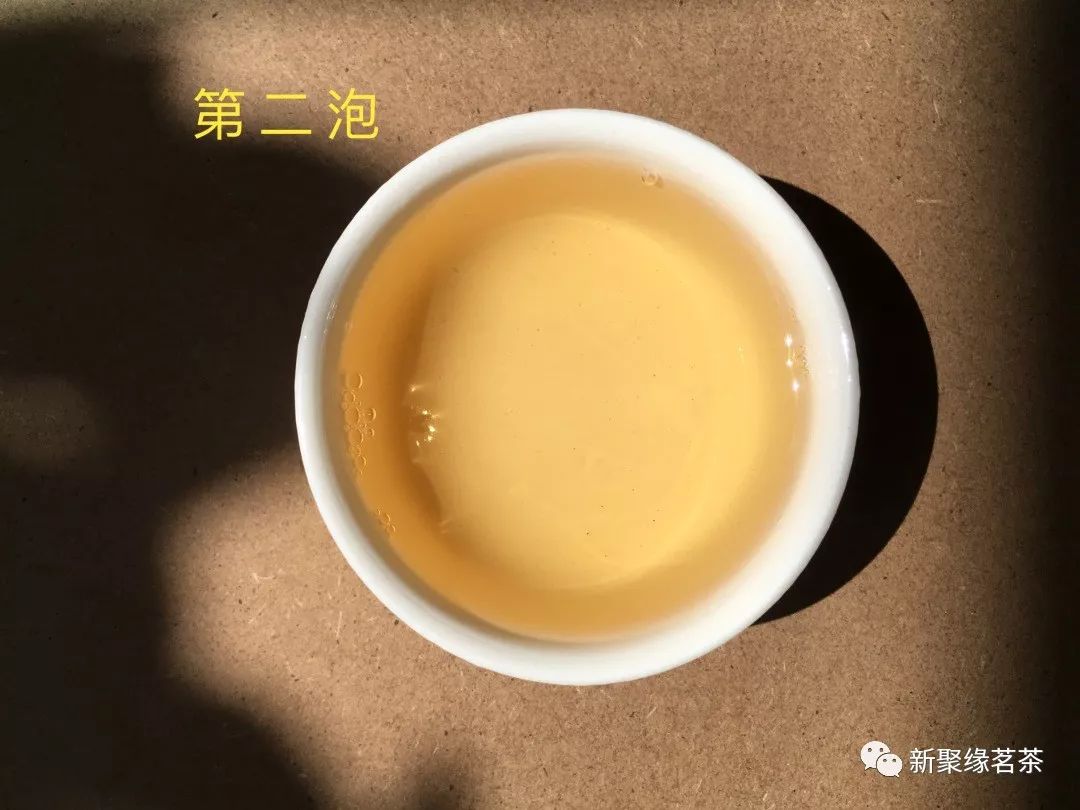 第二泡:湯色黃且透亮,茶湯蜜香與青香交融,圓潤飽滿,入口即甜,生津回甘較快且持久,口齒留蜜香,喉韻顯,品飲之后口中非常甜潤。