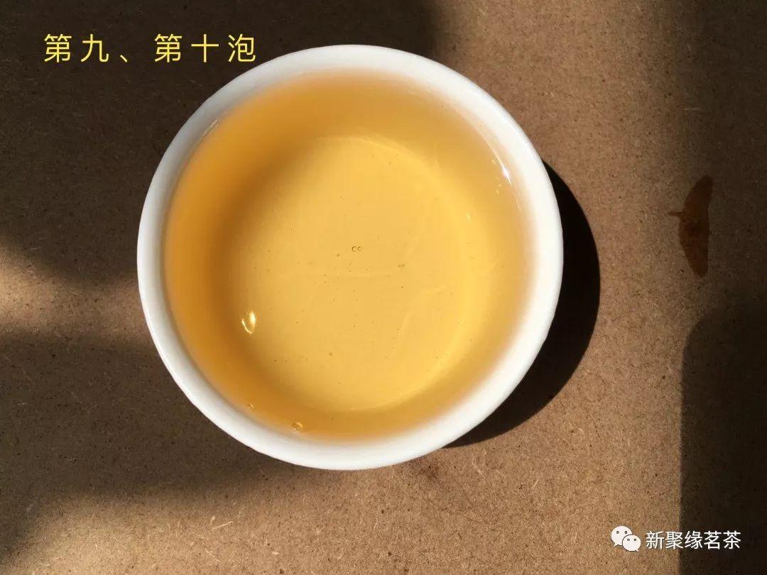第九、第十泡:湯色黃且透亮,茶湯圓潤順滑,清甜細(xì)膩,生津回甘較快,喉韻較深。