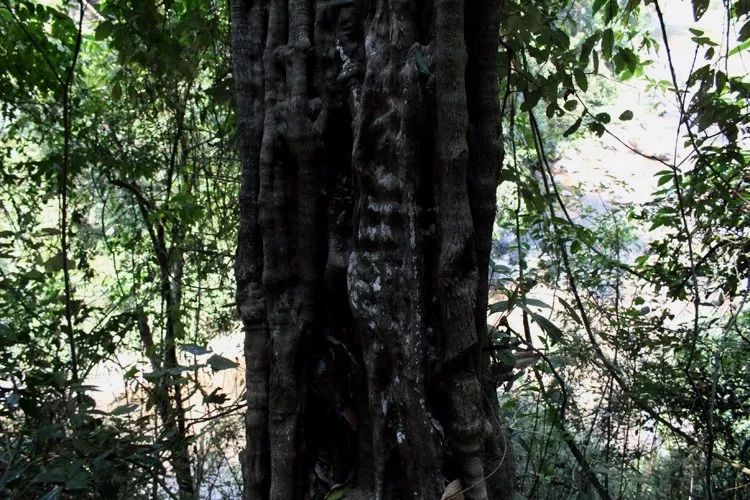 最大的幾十株栽種在屋后的地坎上,樹齡有近千年,其中一棵高11.7米,根部最大徑圍2.74米,是目前漫灣古茶山中發(fā)現(xiàn)的最大的栽培型古茶樹,枝繁葉茂,樹干蒼勁彎曲,猶如蛟龍出海,被稱為