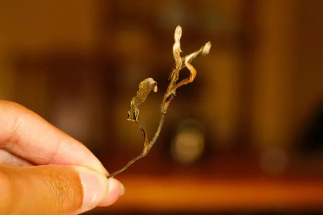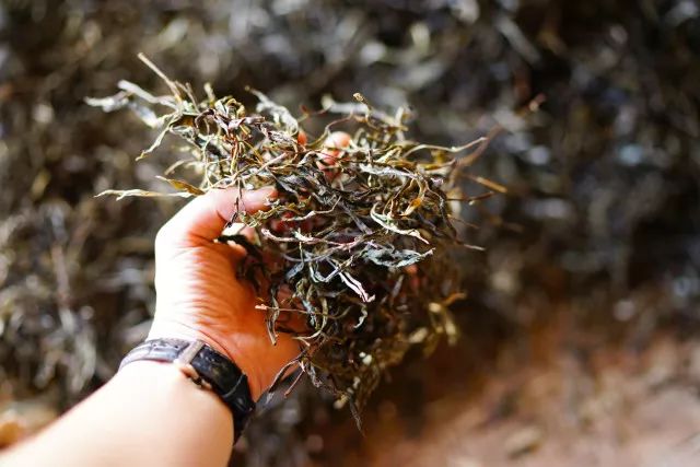 天門山的干茶條索粗壯狹長極為顯眼,有的條索能有手掌那么長,條索顯得凌亂又狂野,與一般古樹茶比起來真得很獨特。