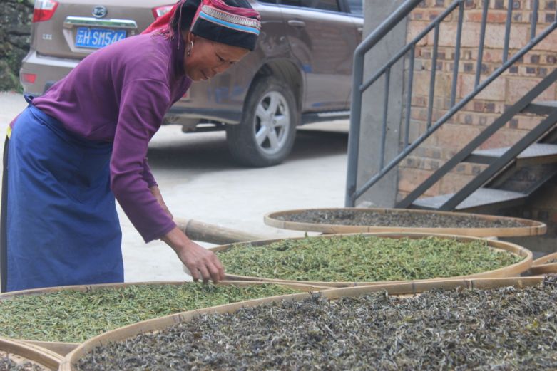 茶葉采自文山麻栗坡野生大葉種古茶樹(shù) 采茶的要點(diǎn): 要一根一根的采, 采兩葉一芽,沒(méi)芽的不要, 采老了黃葉片多,不能采太老。 房間里攤晾,讓葉片部分脫水,葉片回軟,桿莖無(wú)彈