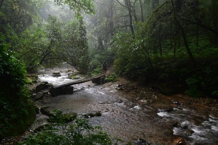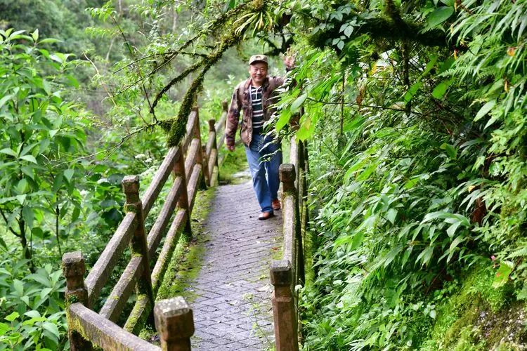 崇山峻嶺的氣候多變。走過這個(gè)木橋時(shí),陽光從密林中泄入,一片溫暖。而返回時(shí),在同一個(gè)木橋上,秋雨密布,一片嘩然。