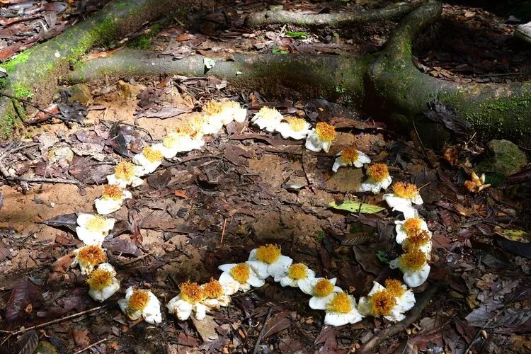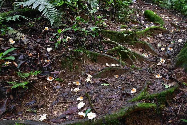路途崎嶇不平,或踏樹根為階梯,或越枯木而過。有時(shí)茶花遍地,白色耀眼,分外讓人憐愛,不忍腳踩。