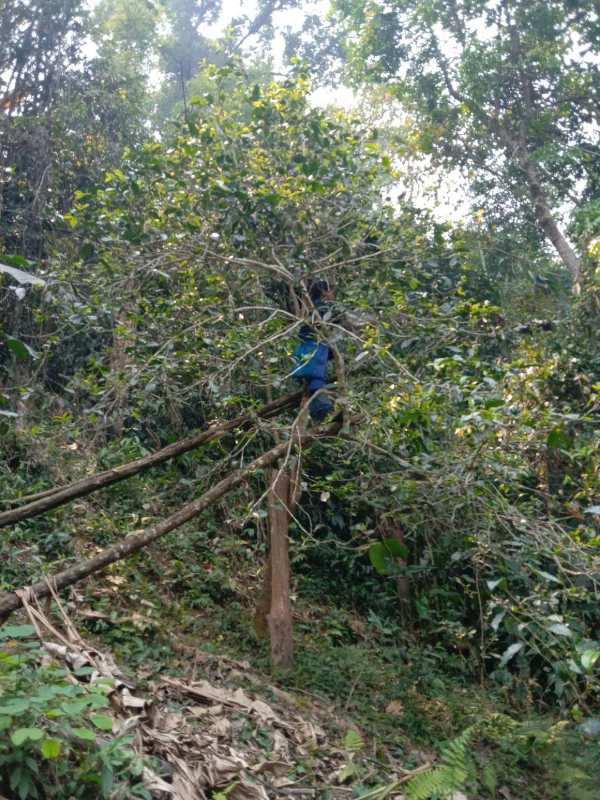 由于茶樹(shù)較高,采茶需要爬到樹(shù)上去采摘鮮葉。