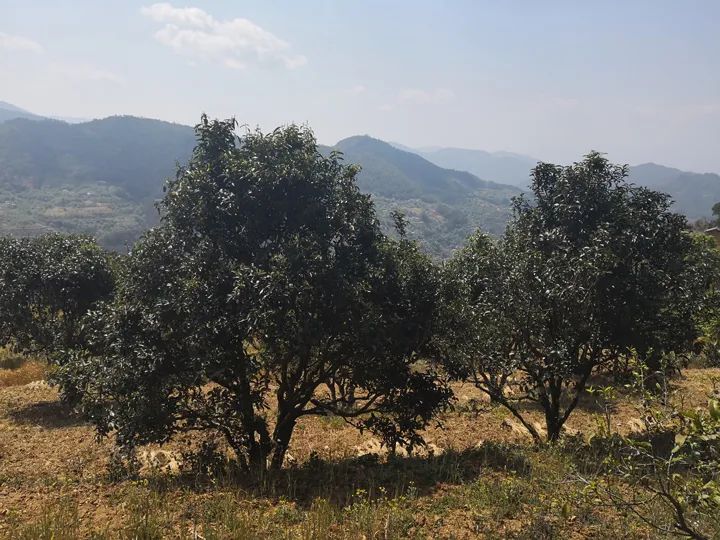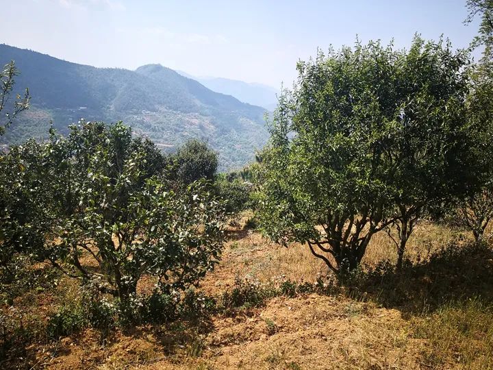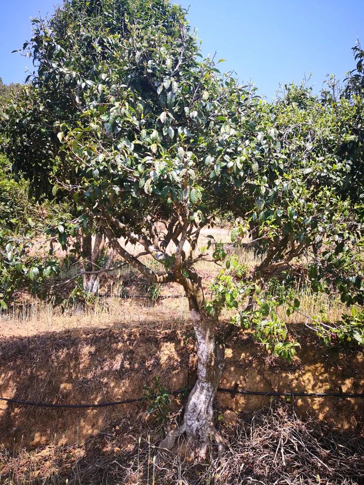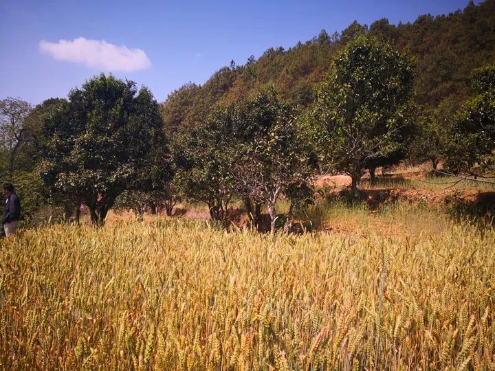 而竹者古茶園茶樹種在地的坎角,與地面水平,茶樹保水肥效果好,下臺地種的樹,在上一臺地之間形成一個2米左右高的地埂,方便管理、采摘,也節(jié)約土地。地中間留作種糧,以播種玉米和小麥為主,茶樹長勢很好,樹形高大,這樣的茶園在云南茶區(qū)著實不多見,因此我單獨把竹者古茶園列出來介紹。