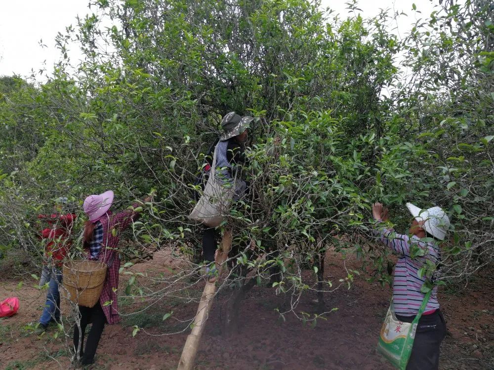 茶樹比較集中連片,多為藤條茶,樹幅也較大,當地茶農常常要用木頭或者竹子自制采茶樓梯爬樹摘茶,由于樹幅較大,鮮葉較多,很多時候,一個茶農從早到晚都摘不完一株樹上的茶葉。