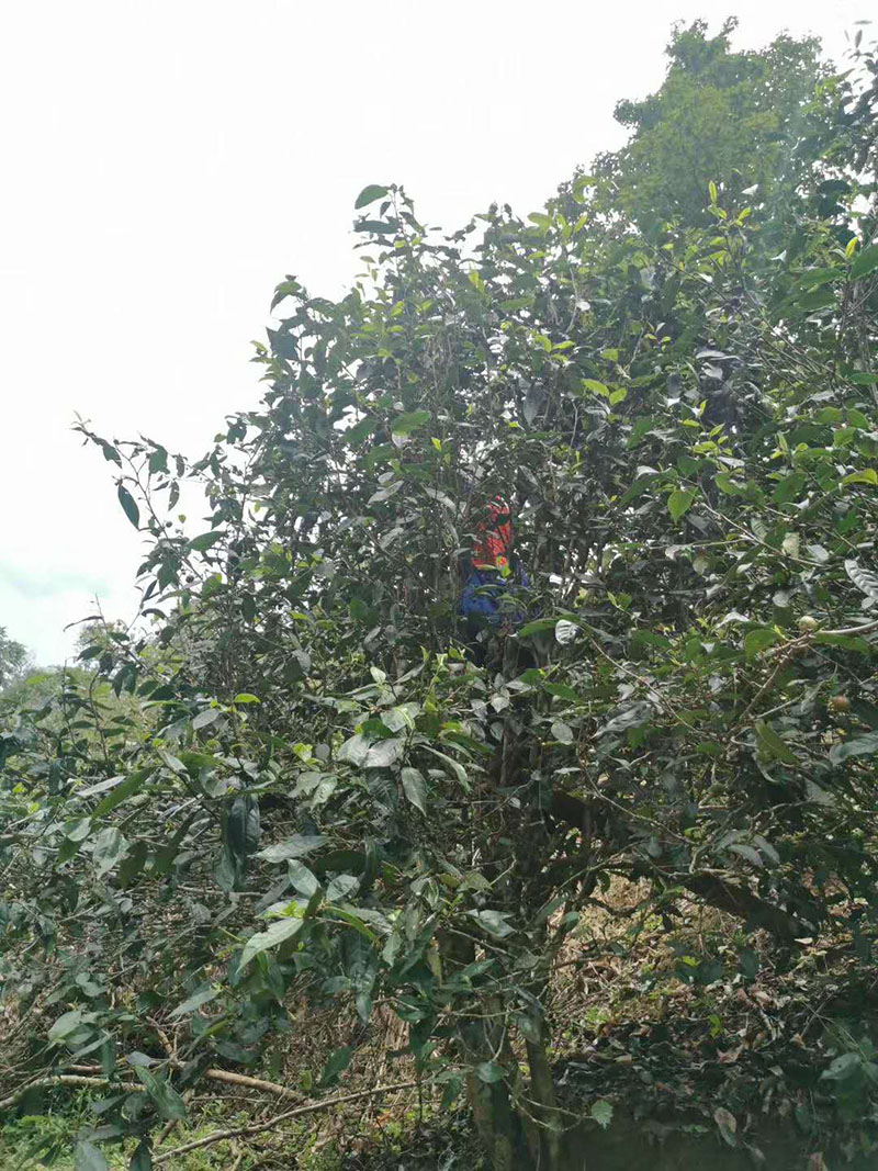 最大的幾十株栽種在屋后的地坎上,樹齡有近千年,其中一棵高11.7米,根部最大徑圍2.74米,是目前漫灣古茶山中發(fā)現(xiàn)的最大的栽培型古茶樹,枝繁葉茂,樹干蒼勁彎曲,猶如蛟龍出海,被稱為