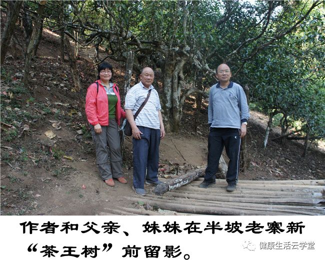 向陽村的“南糯茶王樹”死去后,2001年云南省茶科所和勐??h茶葉辦的專家在南糯山半坡老寨的古茶園里,又發(fā)現(xiàn)了一棵也有800多年樹齡的栽培型茶樹,并命名為新的南糯山茶王樹,用鐵絲網(wǎng)圍護起來。茶王樹雖然在半坡老寨,但是所有權(quán)卻屬于竹林寨村民的。我們一家人滿懷著激動和崇拜的心情,瞻仰了這株老茶樹。