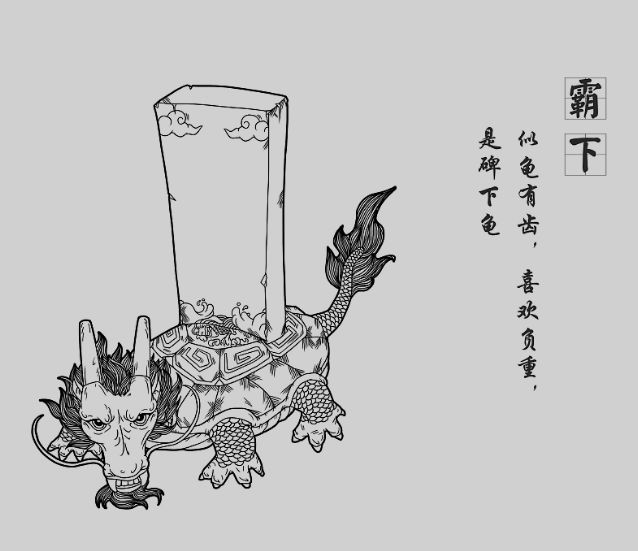 龍六子·霸下平生好負(fù)重,力大無(wú)窮,經(jīng)常雕刻于石碑下方。一些名勝古跡的石碑基座都由霸下馱起。