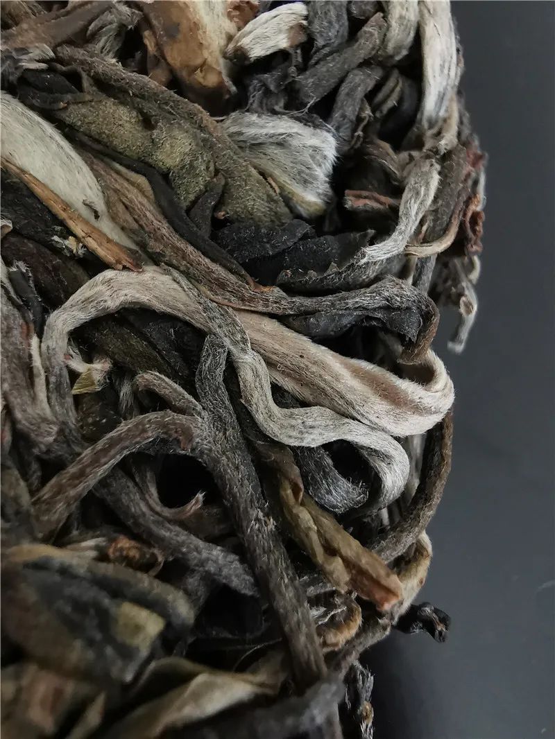 麻黑在外形上和一般的易武茶也沒有太大區(qū)別,葉質(zhì)粗大,葉脈隆起,葉背絨毛多顯毫,梗較長,餅面烏黑油亮!