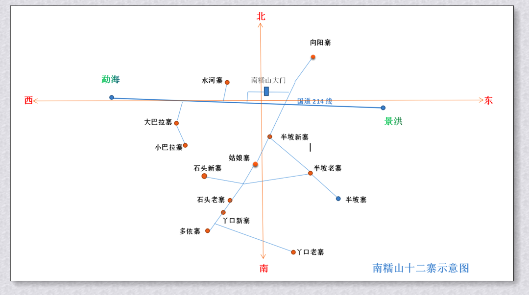南糯山十二寨當(dāng)中,如果以景洪到勐海之間由東向西的214國(guó)道為分界線,除水河寨與向陽寨在此分界線的北邊,其余十個(gè)寨子均位于分界線的南邊,其中大、小巴拉寨沿分界線距南糯山大門往勐海方向不到2公里,其余八個(gè)寨子則較為集中。
