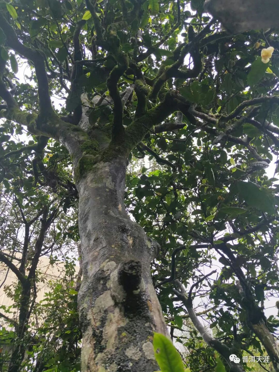 最大的幾十株栽種在屋后的地坎上,樹(shù)齡有近千年,其中一棵高11.7米,根部最大徑圍2.74米,是目前漫灣古茶山中發(fā)現(xiàn)的最大的栽培型古茶樹(shù),枝繁葉茂,樹(shù)干蒼勁彎曲,猶如蛟龍出海,被稱為
