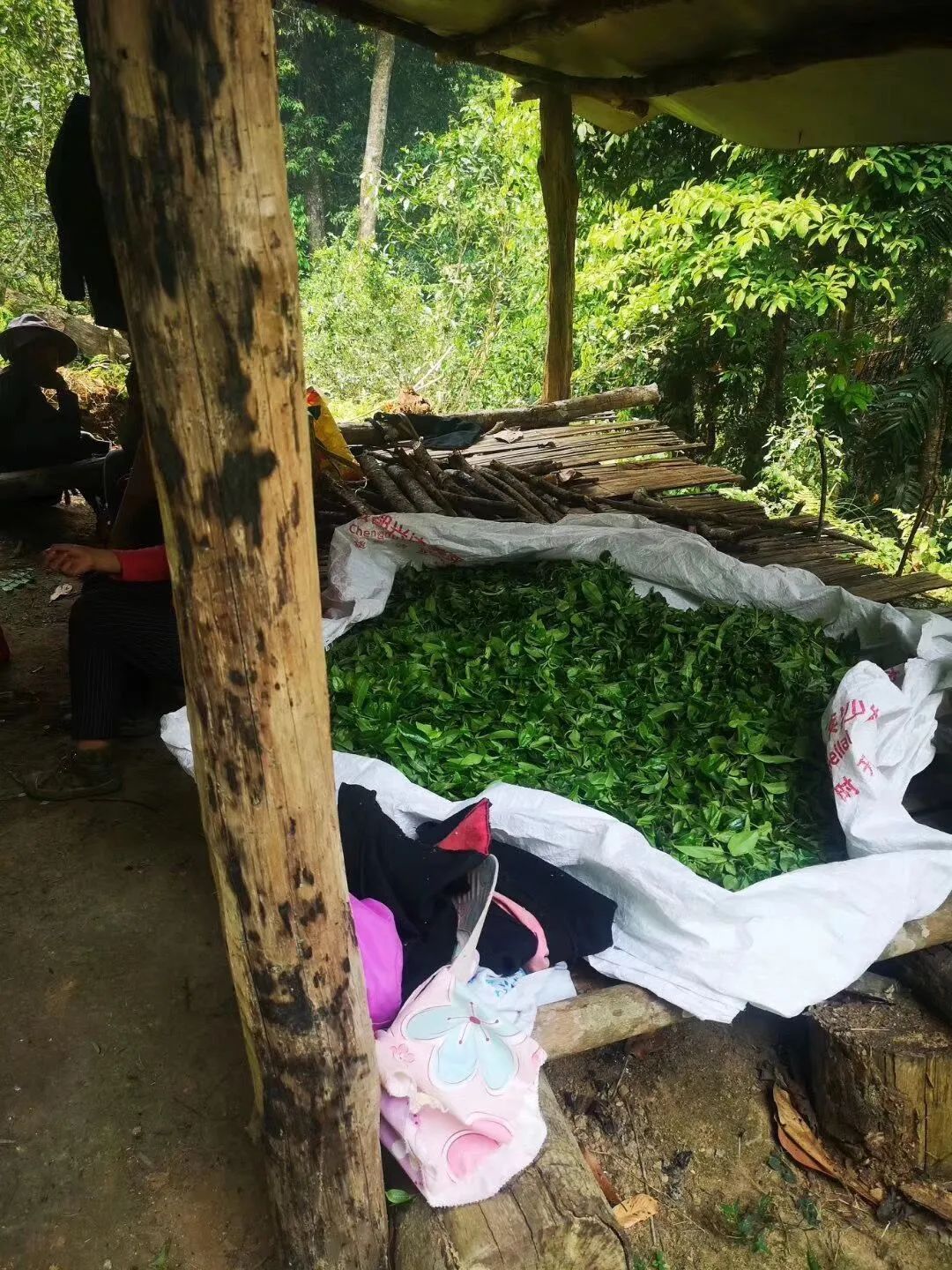 做茶王樹的茶葉,每一家有茶王樹地的農戶都會在自己的地里搭建工棚,采鮮葉后,就地初加工后,等制成干茶后再背出來。一般情況下當地的茶農不愿意當天往返,除非有人特別要求。因為鮮葉從山里背回寨子這一段路都是上坡、耗時間長,鮮葉會被捂到,萎凋過度導致紅梗紅葉,殺青之后嚴重影響茶葉品質。