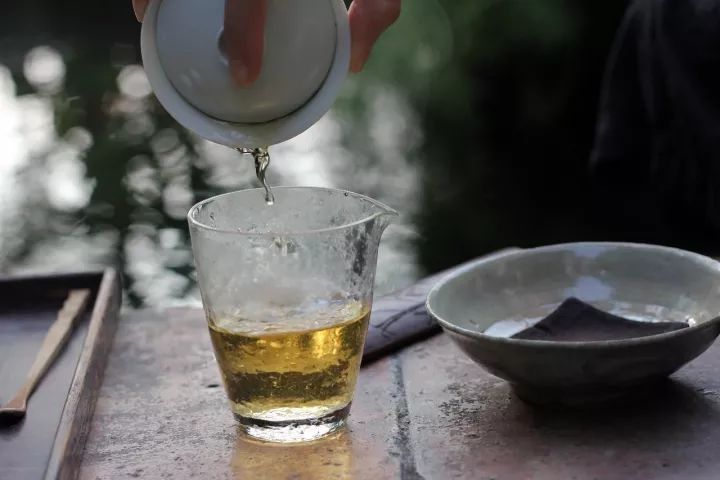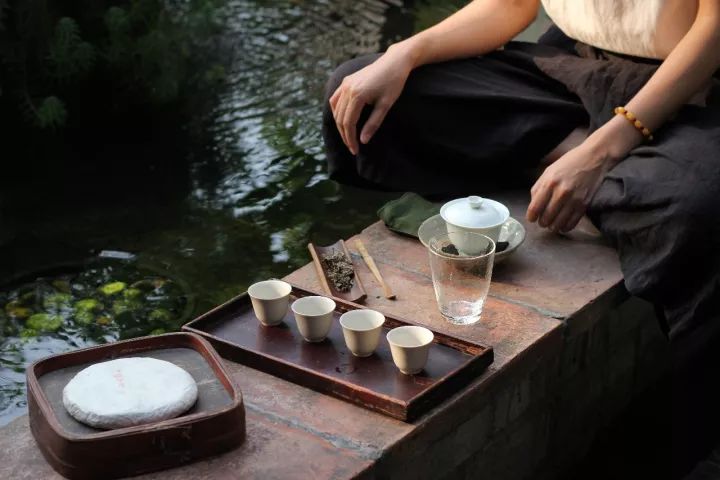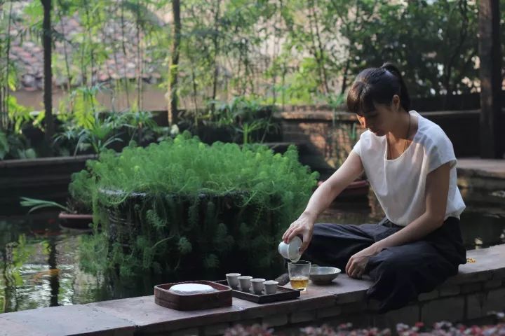 跟隨嘉綺老師來到花園,我們沐浴在秋日午后的陽(yáng)光下,把東西推開,我們坐在池塘邊上的老地板凳子上。水很快就燒開了,水剛注入蓋碗仿佛一下就激活了碗中的茶葉,茶香立即就傳到了我的鼻孔直通神經(jīng)。我們仿如置身于郊外,園子里彌漫著野外的氣息。