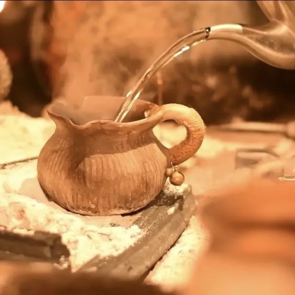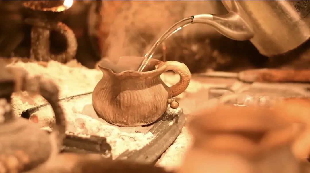 烤茶罐加熱完畢,再把之前理好的茶葉投入到烤茶罐里,馬上抖動(dòng)烤茶罐翻滾茶葉,烤茶罐溫度越高翻抖的頻率速度也就越快,如同廚師炒茶顛勺一般,讓茶葉在烤茶罐里翻滾起來(lái)達(dá)到均勻受熱的目的。直到烤茶罐里烤茶顏色變白變黃、變暗紅 (5分熟、7分熟、10分熟、13分熟、焦糊香),將開(kāi)的沸水,大水快沖注入,水位達(dá)烤茶罐脖子處即可,隨即倒入一勺冷水,讓翻滾的壺水平靜下來(lái),使壺中的水“恢復(fù)生機(jī)”,翻滾的沸水出湯,這才算是烤茶完畢。