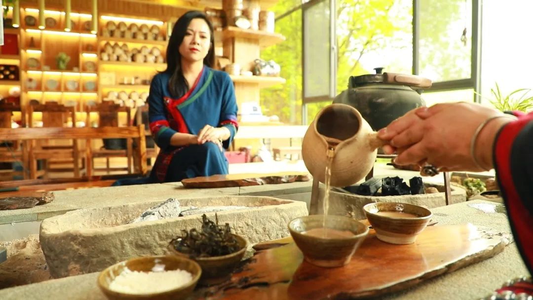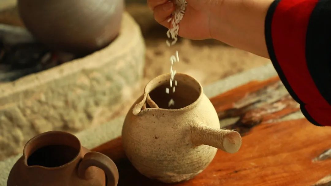 紅彤彤的木炭火,烤熱乎的土罐子。把米烤黃,把茶烤香,一壺水沖下去,火塘周圍都是茶米香。等這火塘烤茶滾起來的時候,姜標(biāo)阿姐告訴我“好喝的烤茶就是要耐心去等它”。