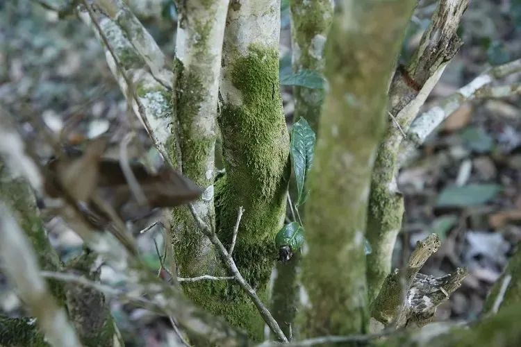 新班章的古茶樹同樣生存在生態(tài)環(huán)境好的森林中,與森林古樹伴生。古茶樹的直徑可達(dá)40公分,高達(dá)四五米,采摘鮮葉時需用竹梯或木樁搭靠采摘。