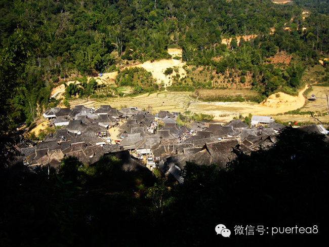 傣族寨后面,壩子盡頭是一條高高的如屏障一樣的大山,那就是帕沙山,五個(gè)哈尼族分布在半山腰。帕沙山很大,綿延10多公里,北接蘇湖,西接勐混鎮(zhèn)的賀開,東與景洪市小街鄉(xiāng)接壤,帕沙在行政區(qū)劃上是一個(gè)村委會(huì),轄5個(gè)哈尼族寨,最大的寨子是帕沙老寨有上百戶人家,最小的新寨也有30多戶,各個(gè)寨子相距1公里左右,寨與寨之間能互喊對望,帕沙古茶面積大,無論大寨、小寨、新寨、老寨,寨寨都有古茶園,古茶園將5個(gè)寨子相接相連,有不少大茶樹就屹立在寨子中間,老寨有棵茶王樹樹圍已達(dá)2.1米,被云南省茶科所命名為帕沙1號(hào)。