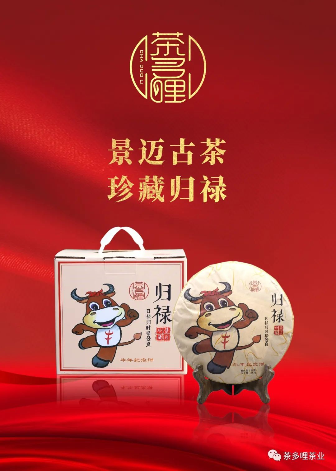 茶多哩牛年紀念餅,采自景邁古茶山千年福澤的古樹嫩葉為原料,傳統(tǒng)工藝精細制作,取流淌于景邁茶山清盈潔凈的天潤雨露,足額發(fā)酵55天,陳化三年,石磨人工壓制成餅,名為“歸祿”。