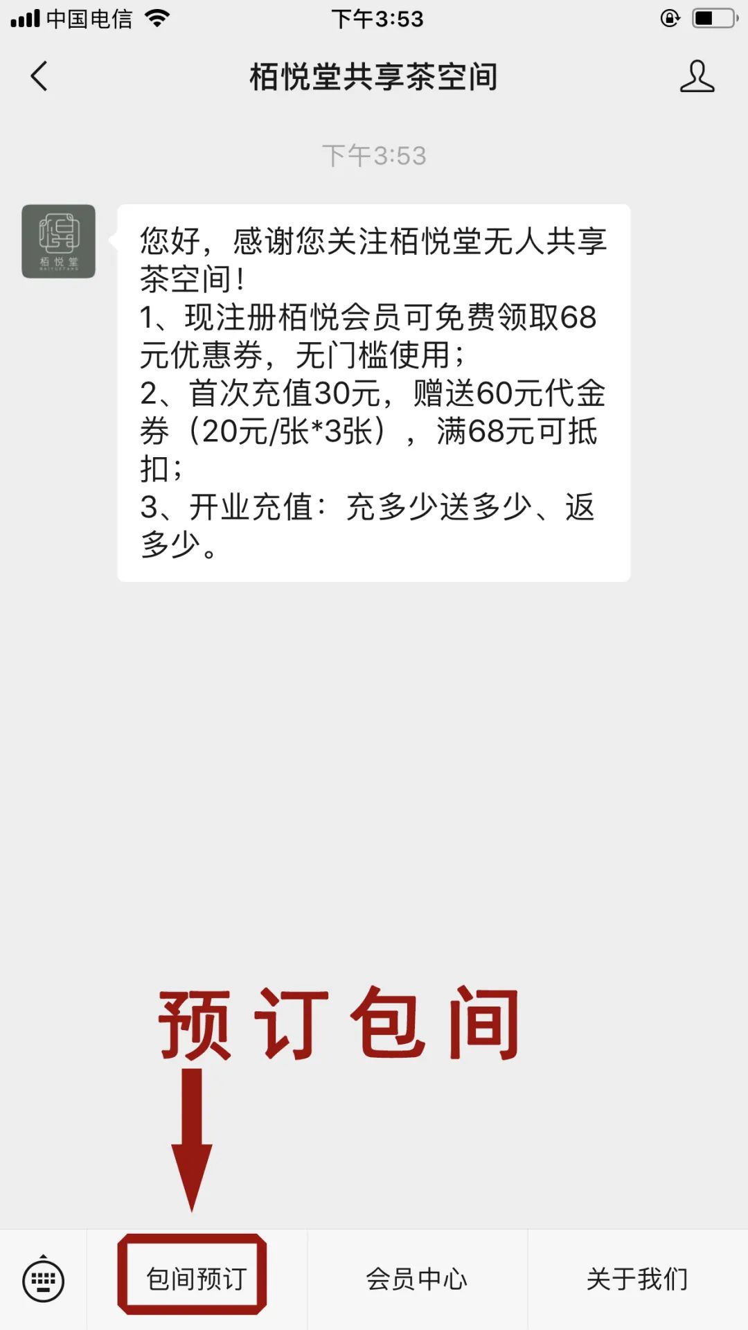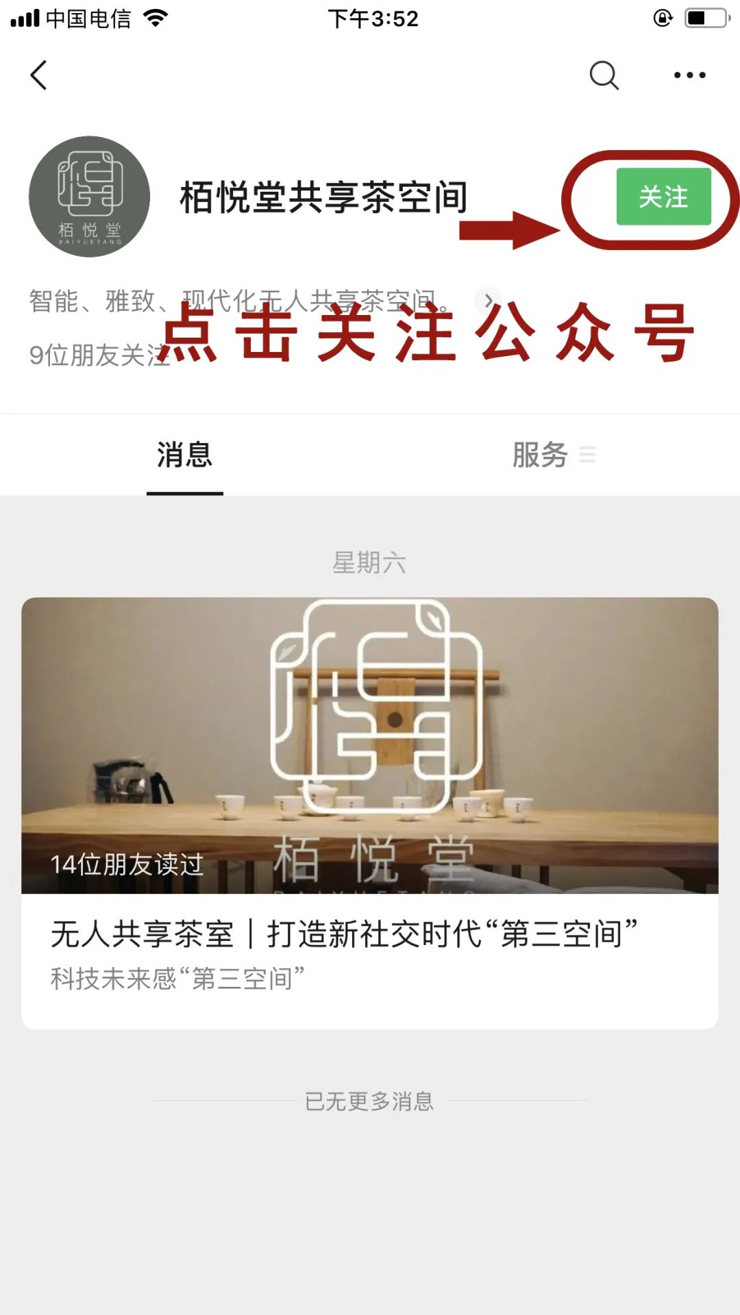 1、打開微信,搜索“栢悅堂共享茶室”公眾號