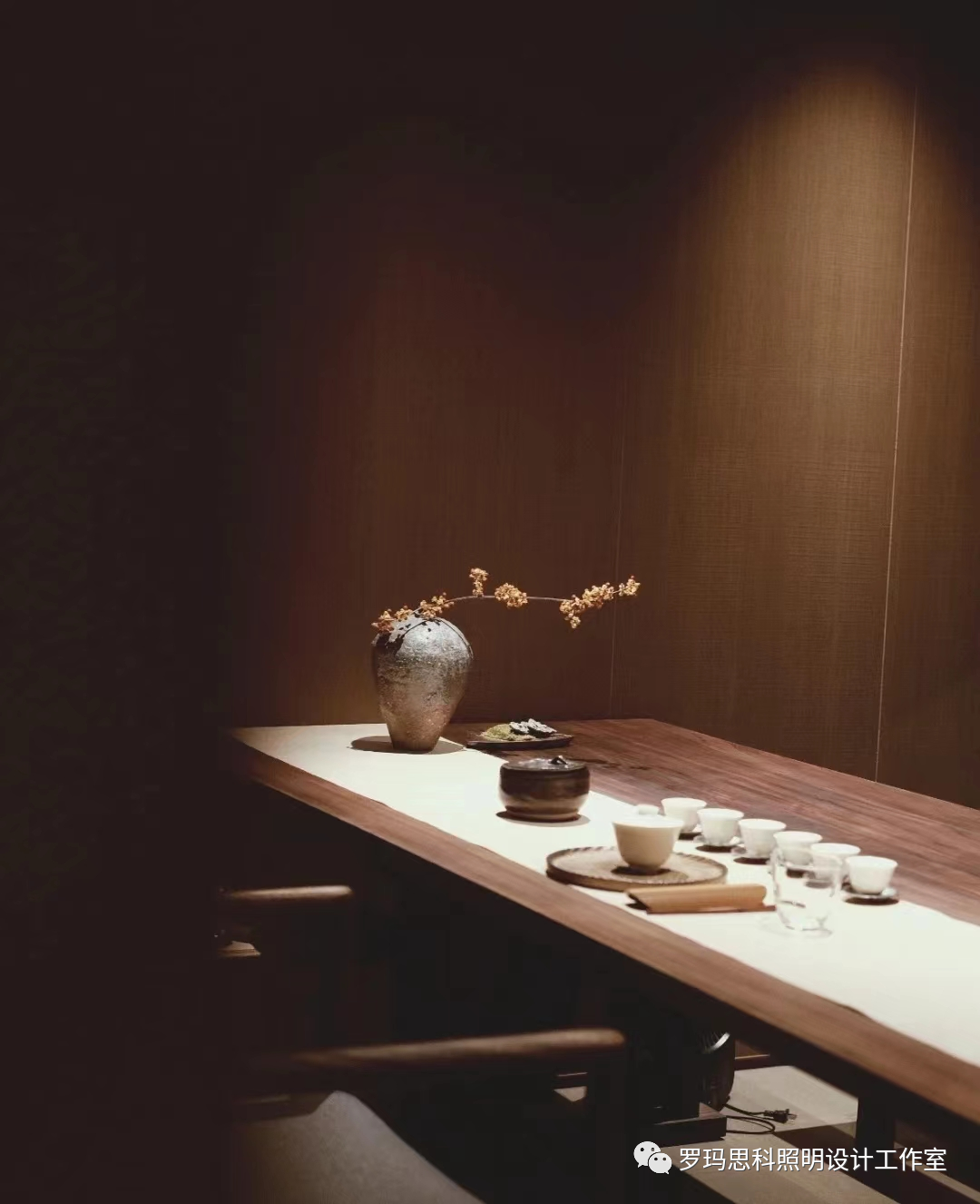茶臺(tái)上方利用藝術(shù)吊燈給予桌面照度,同時(shí),搭配小角度射燈,可對(duì)茶具和茶臺(tái)擺件進(jìn)行重點(diǎn)照明的同時(shí),還可切換用光模式。