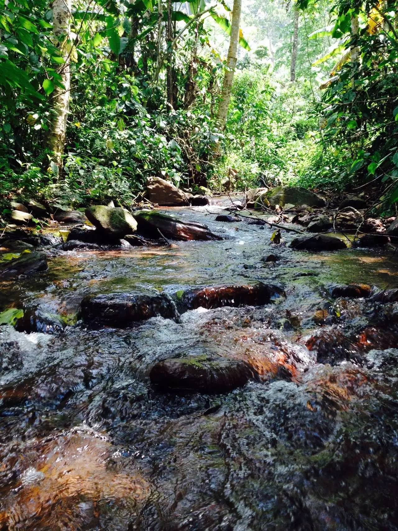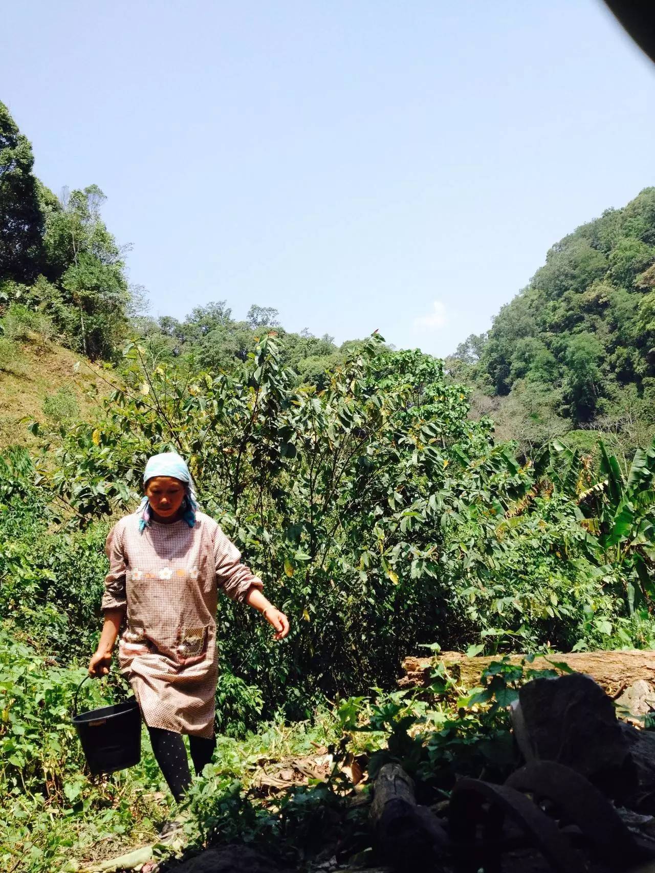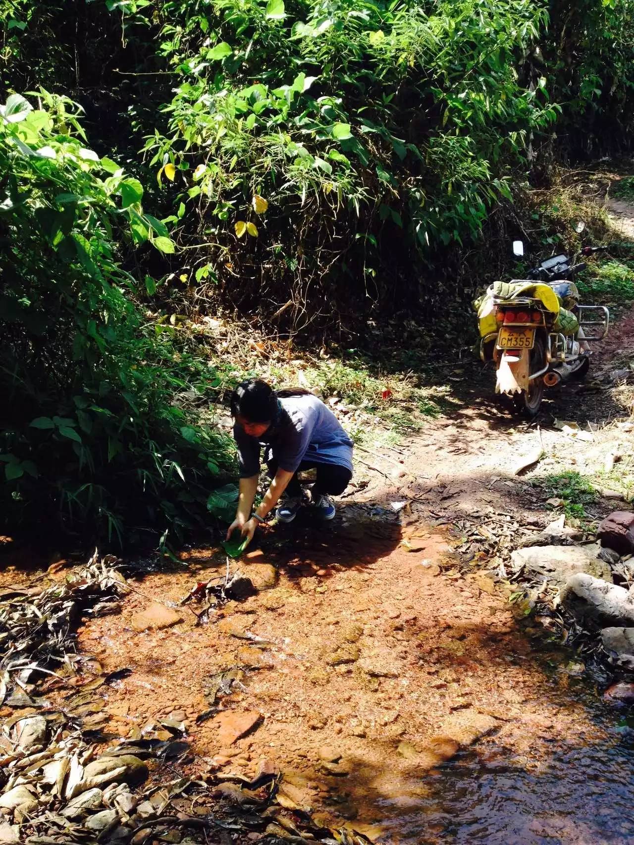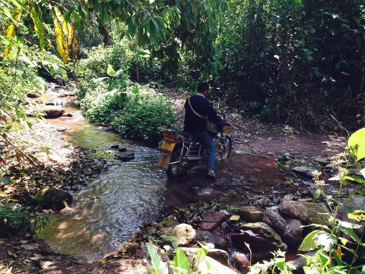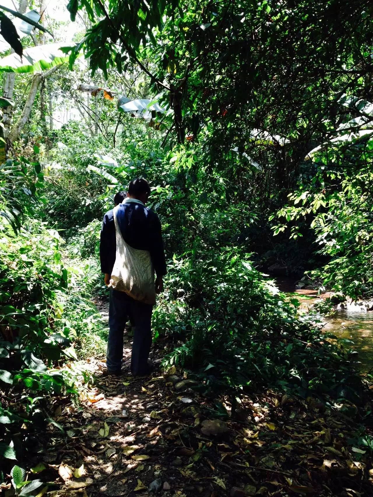 茶坪離寨子不近,騎摩托車到茶地近兩個小時。出寨子往麻黑方向騎半個鐘左右開始下坡,坡極陡且窄,車頭開道,左右芒草拂膝,伴有130度以上的急拐彎。山底是清澗,過溪,繼續(xù)爬坡。山上是原始密林,半山腰生長著原始蕨類植物:桫欏,山谷是連片的野生芭蕉林,林中藏著嘩啦啦的小溪。小溪邊臨時休整,摘一片芭蕉葉,捧泉水解渴。茶農(nóng)點(diǎn)完一根煙后,繼續(xù)走。翻過山坳,還是下坡、過溪、上坡,又翻了兩座山。太陽毒辣,山風(fēng)清涼,花香、鳥叫、茶香。