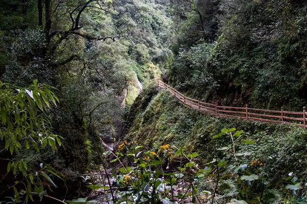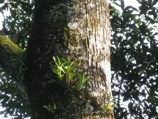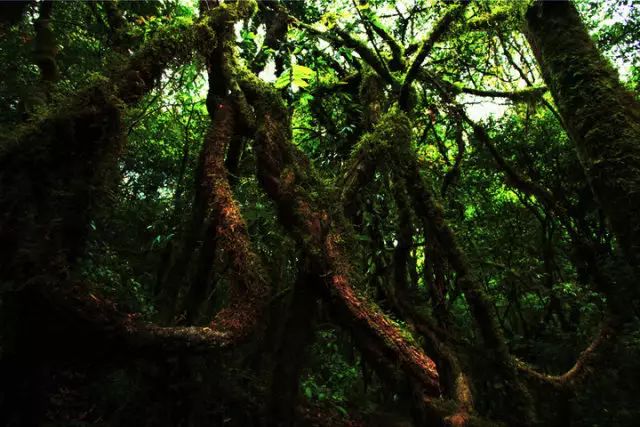 住在深山老林的茶祖一直在冥冥之中召喚著我們。清澈明快的嘟嚕河蜿蜒于原始叢林中,河水時(shí)而潺潺,時(shí)而奔騰。走過彩虹橋,爬過石頭山,地勢逐漸平緩起來。我們進(jìn)入了莽莽蒼蒼的原始大森林——亞熱帶濕性常綠闊葉林地帶。古木參天,蒼翠茂密,鳥語花香。歷盡滄桑的每一棵樹上都長滿了綠色的苔蘚、藤蔓和許多寄生蘭花等附生物。就像俊男靚女們穿上了一件件淺綠色的風(fēng)衣,讓你分不清樹的品種。閱讀樹上掛著旳一塊塊木牌,才知道千家寨除了生長著大小不一的古茶樹外,還有木果柯、多花含笑、紅花木蓮等1486個(gè)高等植物品種。抬起頭一幅春夏的景色映入眼簾:綠蔭疊翠,青藤蔓繞。該發(fā)芽的還是發(fā)著嫩嫩的芽,該開的花還是張揚(yáng)地開著。行走在叢林中,聽不到嘩嘩的風(fēng)聲,也聽不見沙沙的松濤聲,就連小鳥的叫聲也成了竊竊私語,蟈蟈、蟋蟀的聲音也是輕輕細(xì)細(xì)的。把心沉淀,過濾,享受這一刻古茶林的寧靜與芳香。