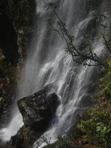 近了,近了,我們聽到了轟隆隆的水聲。身上越來越冷,一轉(zhuǎn)彎,突然看見了一股白色的銀鏈從山崖上噴涌而出,跌入深潭,變成清澈透明的泉水嘩嘩地奔下山谷,這是小吊水瀑布。我張開雙臂擁抱了這自然美景。任由飛濺過來的水珠潑灑在臉上,美美地做了一次天然補(bǔ)水面膜,感到溫潤而愜意。