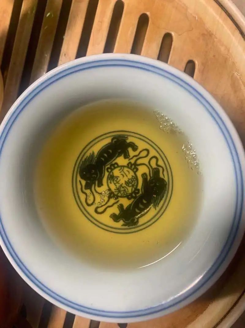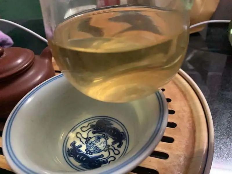 洗茶茶湯來(lái)看,湯色淡黃明亮,十分透徹。