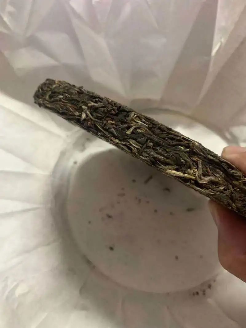 打開(kāi)棉紙包裝看茶餅兩邊茶條相對(duì)比較肥碩,有部分芽頭,整體色澤趨于統(tǒng)一,可以大致判定應(yīng)該是純料茶。