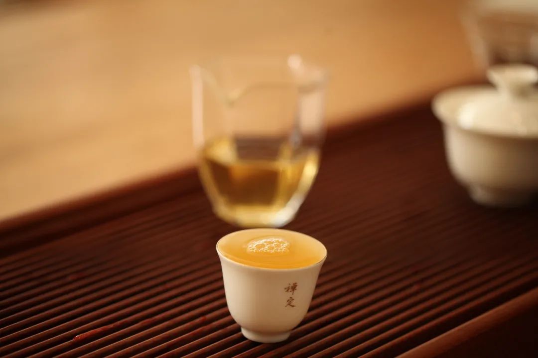 第一泡醒茶潤茶之后,溫嗅公道杯,此時杯身滿溢馥郁花蜜香。湯未飲,人先“醉”。湯香濃沉,滿室盈香。
