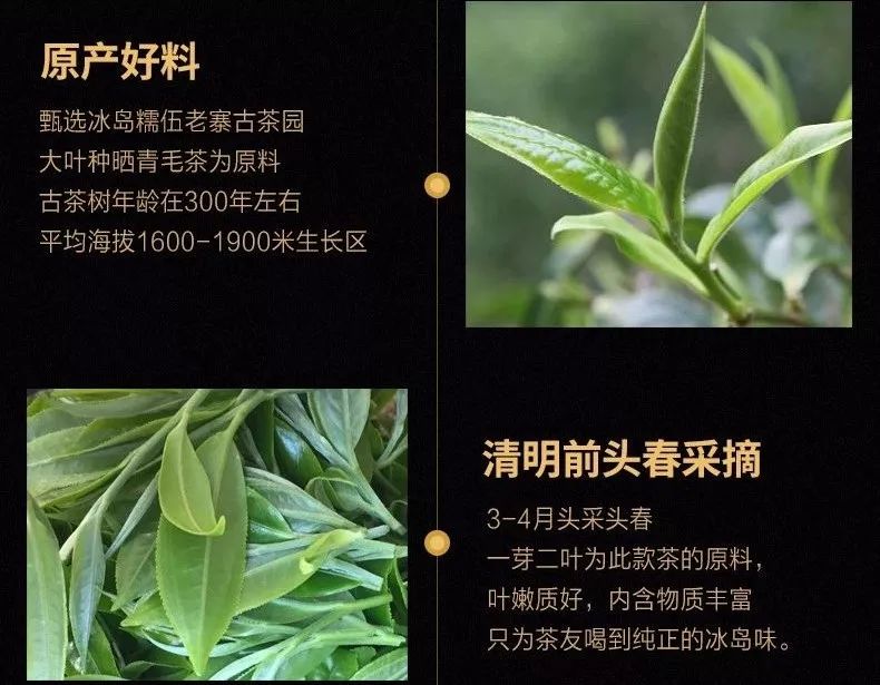 冰島糯伍古茶是典型的勐庫(kù)大葉茶種喬木樹,樹冠最高可達(dá)10米以上,大多數(shù)單株生長(zhǎng)且行株距較大,從主干一米高左右處開始分叉,枝繁葉茂,葉長(zhǎng)而寬(長(zhǎng)20厘米、寬9厘米左右),呈墨綠色,葉質(zhì)肥厚柔軟、葉背隆起、葉脈明顯、葉邊緣呈鋸齒形狀,葉片老而青翠,老而不衰;糯伍古樹茶芽持嫩性較強(qiáng),芽葉肥壯厚實(shí),一芽四葉仍顯柔嫩。