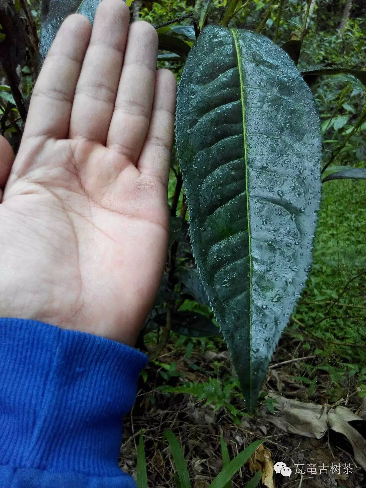 最大的幾十株栽種在屋后的地坎上,樹齡有近千年,其中一棵高11.7米,根部最大徑圍2.74米,是目前漫灣古茶山中發(fā)現(xiàn)的最大的栽培型古茶樹,枝繁葉茂,樹干蒼勁彎曲,猶如蛟龍出海,被稱為