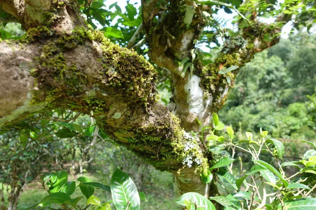 由于這些茶樹樹齡高,都顯得歷盡滄桑、飽含風(fēng)霜。茶樹的枝干上長滿了苔蘚、藤蔓、野生菌類和許多寄生蘭花等附生物,還有一種形狀類似螃蟹的寄生物——螃蟹腳。