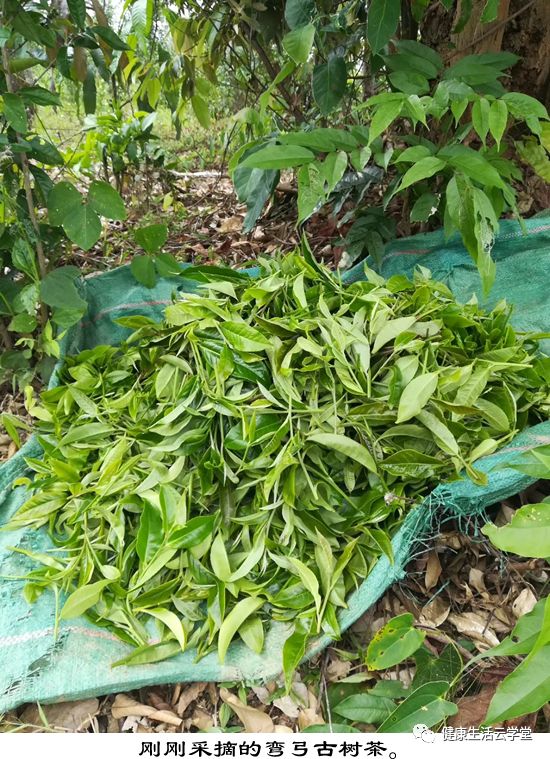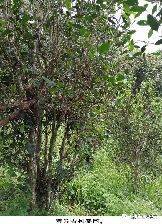最大的幾十株栽種在屋后的地坎上,樹齡有近千年,其中一棵高11.7米,根部最大徑圍2.74米,是目前漫灣古茶山中發(fā)現(xiàn)的最大的栽培型古茶樹,枝繁葉茂,樹干蒼勁彎曲,猶如蛟龍出海,被稱為
