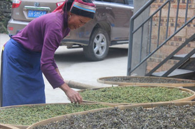 茶葉采自文山麻栗坡野生大葉種古茶樹 采茶的要點(diǎn): 要一根一根的采, 采兩葉一芽,沒芽的不要, 采老了黃葉片多,不能采太老。 房間里攤晾,讓葉片部分脫水,葉片回軟,桿莖無彈