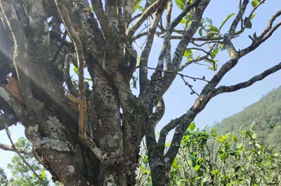 進(jìn)山之路險(xiǎn)阻,不懼之。 我們一行兩輛皮卡,走在峭壁上。 經(jīng)過2個(gè)小時(shí)的車程我們到了小勐峨無公害生態(tài)古茶林,茶葉已經(jīng)開始發(fā)芽。 幾百年的茶樹,是不是和印象中的不一樣! 據(jù)